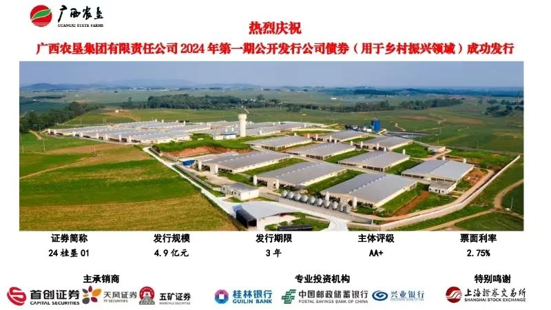 據(jù)悉,該筆債券為今年截至目前廣西地區(qū)唯一一筆發(fā)行成功的公募鄉(xiāng)村振興領(lǐng)域公司債券,募集資金用于支持農(nóng)墾集團(tuán)下屬農(nóng)業(yè)產(chǎn)業(yè)化國家級(jí)重點(diǎn)龍頭企業(yè)、國家級(jí)國企改革“雙百企業(yè)”、自治區(qū)“科改示范企業(yè)”廣西農(nóng)墾永新畜牧集團(tuán)有限公司的穩(wěn)步發(fā)展,助推集團(tuán)生豬養(yǎng)殖產(chǎn)業(yè)加快走向粵港澳大灣區(qū)及加快構(gòu)建綠色鄉(xiāng)村振興產(chǎn)業(yè)。本期債券的發(fā)行預(yù)計(jì)可為集團(tuán)節(jié)約融資成本約617.4萬元。