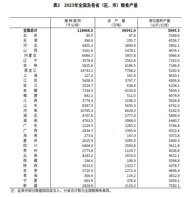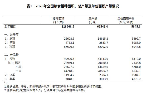 三、全國糧食總產量69541萬噸(13908億斤),比2022年增加888萬噸(178億斤),增長1.3%。其中谷物產量64143萬噸(12829億斤),比2022年增加819萬噸(164億斤),增長1.3%。