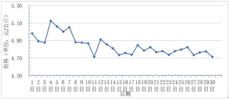 10月,全國(guó)重點(diǎn)監(jiān)測(cè)農(nóng)產(chǎn)品批發(fā)市場(chǎng)香蕉總交易量達(dá)9.2萬(wàn)噸,同比上漲21.1%,環(huán)比上漲1.1%;總交易價(jià)值 42583.1萬(wàn)元,同比上漲24.4%,環(huán)比上漲2.8%。日平均價(jià)格最高為5.2元/千克,最低為4.9元/千克,全月平均價(jià)格為5元/千克,同比上漲6.4%,環(huán)比上漲4.2%(每日價(jià)格變化如圖)。