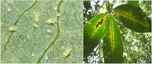 橡膠害螨危害嚴(yán)重時可造成葉片變黃,但其與干旱引起的黃葉不同。害螨引起的黃葉一般不會表現(xiàn)為整個葉片均勻變黃,而是葉片上沿著葉脈顯現(xiàn)顏色較深的受害斑,或葉片表面有呈灰白色似粉灰狀的斑點;而干旱等引起的黃葉則是整個葉片均勻變黃。害螨危害引起的黃化葉片常附有活的蟲體,用手觸壓會有汁液流出,或有蟲體蛻下的白色皮。