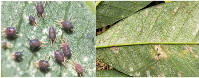 橡膠樹常出現(xiàn)的害螨有黃蜘蛛(六點始葉螨)和紅蜘蛛(東方真葉螨和比哈小爪螨等)。這些害螨有時呈單一種類發(fā)生,有時多種同時發(fā)生,主要以口針刺入植物組織吸取細(xì)胞液而造成危害。受害葉片初期受害點呈灰白色斑點,繼而變黃色乃至黃褐色,且受害斑不斷擴(kuò)大,嚴(yán)重時整個葉片黃化脫落。高溫干旱及葉片上白粉病等病害引起的殘存病斑加快加重葉片黃化和落葉,致使膠園停割,影響產(chǎn)量。