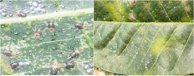 不同種類害螨危害癥狀有差別。六點始葉螨多在葉背危害,初期在葉脈基部呈現(xiàn)灰白色斑點,繼而沿葉脈擴(kuò)展,同時顏色變深為黃色及黃褐色。六點始葉螨在嫩梢嫩葉的危害,呈現(xiàn)出受害部位顏色變深,扭曲畸形。東方真葉螨多在葉面危害,少見于葉背,受害部位出現(xiàn)白色小斑點,繼而小斑點匯結(jié)成灰綠色斑塊,嚴(yán)重者全葉枯黃。比哈小爪螨多發(fā)生在葉背危害,偶見葉面。葉片受害部位呈均勻的灰白色小斑點,發(fā)生嚴(yán)重時,整個葉片呈灰白色斑點,繼而整個葉片變黃,最后導(dǎo)致葉片枯黃。
