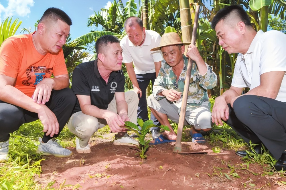 9月5日,在瓊山區(qū)紅旗鎮(zhèn)道崇村的檳榔地里,海南邁咖農(nóng)咖啡有限公司工作人員和村民一起查看咖啡苗長(zhǎng)勢(shì)。本報(bào)記者 蘇弼坤 攝