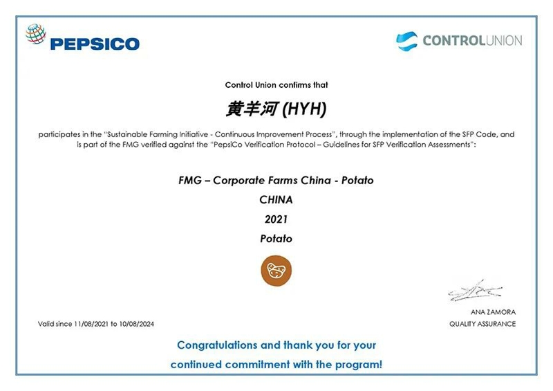 近日,甘肅農(nóng)墾黃羊河集團(tuán)公司榮獲百事公司“可持續(xù)發(fā)展農(nóng)業(yè)項目(簡稱“SFP”)中國馬鈴薯農(nóng)場”認(rèn)證,認(rèn)證有效期3年。