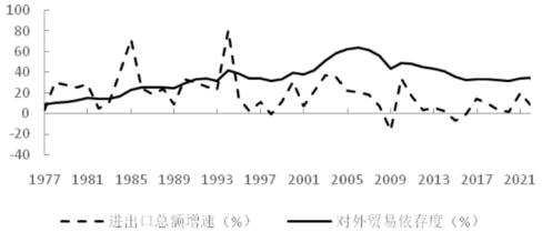 圖2 中國進(jìn)出口貿(mào)易總額增速和對外貿(mào)易依存度變化趨勢