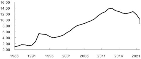 城鎮(zhèn)化進(jìn)程,帶來房地產(chǎn)業(yè)的迅猛發(fā)展,“城鎮(zhèn)化紅利”造就巨大的“房地產(chǎn)紅利”,而房地產(chǎn)投資占GDP的比重從20世紀(jì)90年代后半期一直到2018年左右,一直呈直線上升趨勢,2015年達(dá)到13%左右(見圖3)。房地產(chǎn)經(jīng)濟(jì)的迅猛增長,既是拉動這一階段經(jīng)濟(jì)增長的主要引擎,同時(shí)也加劇了這一時(shí)期房地產(chǎn)泡沫的形成,房地產(chǎn)泡沫與銀行房地產(chǎn)貸款虛增、地方城投債膨脹和超大規(guī)?;A(chǔ)設(shè)施建設(shè)一起,為2020年之后我國金融風(fēng)險(xiǎn)的大量累積埋下了伏筆。從總體上來說,應(yīng)該從正反兩方面來看待房地產(chǎn)經(jīng)濟(jì):一方面房地產(chǎn)經(jīng)濟(jì)是中國快速城鎮(zhèn)化的產(chǎn)物,城鎮(zhèn)化紅利必然帶來房地產(chǎn)紅利,各國城市化的歷史進(jìn)程都驗(yàn)證了這一點(diǎn),因此房地產(chǎn)經(jīng)濟(jì)在20世紀(jì)90年代之后的崛起是一個(gè)必然現(xiàn)象;另一方面,房地產(chǎn)投資的過快膨脹已經(jīng)脫離了“實(shí)體經(jīng)濟(jì)”的范疇,帶有某些金融投機(jī)的性質(zhì),極容易引發(fā)系統(tǒng)性金融風(fēng)險(xiǎn)。