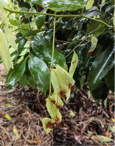 當前我國荔枝主產(chǎn)區(qū)除海南外,廣東、廣西以及福建的荔枝中晚熟品種由南往北陸續(xù)進入盛花期。荔枝花穗易感霜疫病,連續(xù)陰天多雨則發(fā)生流行,導致大量小花甚至整個花穗腐爛。近期,荔枝病蟲害監(jiān)測與防控專家分別對粵西、粵東和珠三角地區(qū)部分荔枝果園表層土壤進行了荔枝霜疫霉誘導和檢測,帶菌率超過95%,表明病原菌基數(shù)處于高位;前段陰雨潮濕,土壤中的荔枝霜疫霉已傳播到貼近地面的嫩葉并導致發(fā)病(圖1),個別果園的花穗也發(fā)現(xiàn)了霜疫??;一旦荔枝霜疫霉傳播到樹上,在陰雨高濕天氣條件下將會快速蔓延。據(jù)中國天氣網(wǎng)30日天氣形勢預報:未來10天南方地區(qū)多陰雨天氣,降水量10~40毫米,部分地區(qū)50~90毫米,降水量較常年同期偏多。因此,荔枝病蟲害監(jiān)測與防控專家建議廣東、廣西、福建等荔枝主產(chǎn)區(qū)農(nóng)業(yè)農(nóng)村主管部門及農(nóng)業(yè)技術推廣機構積極開展荔枝霜疫病監(jiān)測,指導果農(nóng)及時開展有效防控。