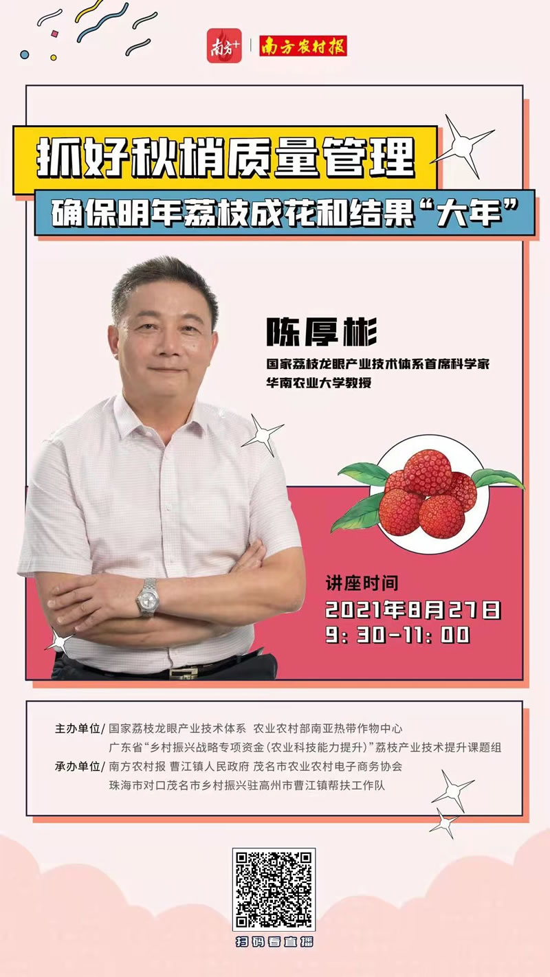 8月27日9:30,國家荔枝龍眼產(chǎn)業(yè)技術(shù)體系首席科學(xué)家、華南農(nóng)業(yè)大學(xué)教授陳厚彬主講的《抓好秋梢質(zhì)量管理,確保明年荔枝成花和結(jié)果“大年”》將在高州市曹江鎮(zhèn)黨群服務(wù)中心舉辦。本次講座由國家荔枝龍眼產(chǎn)業(yè)技術(shù)體系、農(nóng)業(yè)農(nóng)村部南亞熱帶作物中心和廣東省“鄉(xiāng)村振興戰(zhàn)略專項資金(農(nóng)業(yè)科技能力提升)”荔枝產(chǎn)業(yè)技術(shù)提升課題組主辦,南方農(nóng)村報、曹江鎮(zhèn)人民政府、茂名市農(nóng)業(yè)農(nóng)村電子商務(wù)協(xié)會、珠海市對口茂名市鄉(xiāng)村振興駐高州市曹江鎮(zhèn)幫扶工作隊承辦,為來年荔枝的保果穩(wěn)產(chǎn)保駕護航。