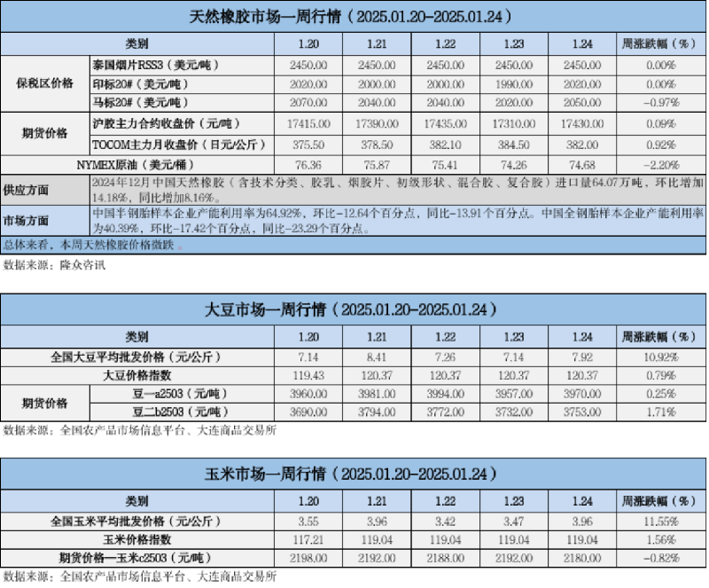 天然橡膠、大豆、玉米市場一周行情(2025.01.20-01.24)