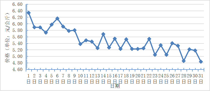 7月,全國(guó)重點(diǎn)監(jiān)測(cè)農(nóng)產(chǎn)品批發(fā)市場(chǎng)香蕉總交易量達(dá)2.2萬(wàn)噸,同比下降4.3%,環(huán)比上漲4.8%;總交易價(jià)值11932.6萬(wàn)元,同比下降6.4%,環(huán)比下降2.8%。日平均價(jià)格最高為6.3元/千克,最低為4.8元/千克,全月平均價(jià)格為 5.5元/千克,同比下降6.7%,環(huán)比下降14.1%(每日價(jià)格變化如圖)。