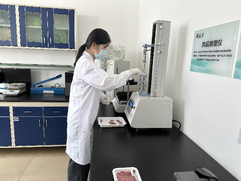 月盛齋公司為了守護(hù)舌尖上的安全與美味也做了不少工作。在肉品檢測(cè)中心,實(shí)驗(yàn)員對(duì)新入廠的牛羊肉進(jìn)行檢驗(yàn),將其提取物滴在檢測(cè)試紙上,對(duì)磺胺類、喹諾酮類等農(nóng)獸藥殘留進(jìn)行精準(zhǔn)檢測(cè),把好食材“入廠關(guān)”。工作人員還會(huì)對(duì)生產(chǎn)加工過(guò)程中的環(huán)境、物品進(jìn)行取樣,并對(duì)其大腸桿菌、菌落總數(shù)、致病菌等微生物進(jìn)行檢測(cè),把好生產(chǎn)加工過(guò)程的“衛(wèi)生關(guān)”。在提升產(chǎn)品質(zhì)量方面,他們用數(shù)據(jù)“說(shuō)話”,通過(guò)指標(biāo)測(cè)定直觀地為生產(chǎn)加工和產(chǎn)品研發(fā)提供參考。例如,“嫩度”是肉品食用品質(zhì)中的重要指標(biāo)之一,不僅決定牛肉質(zhì)量,也是消費(fèi)者和加工者最為重視的性質(zhì)之一。在實(shí)驗(yàn)室里,實(shí)驗(yàn)員通過(guò)儀器剪切樣品時(shí)產(chǎn)生剪切力數(shù)值判斷肉品不同部位、不同烹飪方式的嫩度,便于確定更適宜的加工方式,以達(dá)到最佳口感。