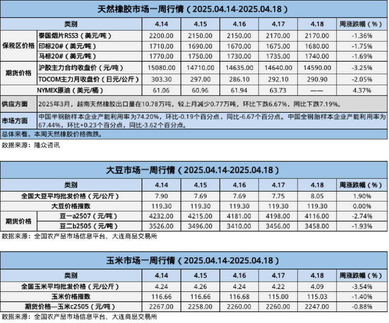 天然橡膠、大豆、玉米市場一周行情(2025.04.11-04.18)