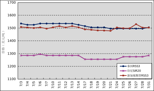 國(guó)外主產(chǎn)區(qū):7月,泰國(guó)RSS3平均價(jià)格為1515美元/噸,環(huán)比下跌73美元/噸,最高價(jià)為1535美元/噸,最低價(jià)為1495美元/噸;印尼SIR20平均價(jià)格為1275美元/噸,環(huán)比下跌19美元/噸,最高價(jià)為1295美元/噸,最低價(jià)為1255美元/噸;新加坡RSS3期貨主力合約月均結(jié)算價(jià)格為1500美元/噸,環(huán)比下跌35美元/噸,最高價(jià)為1530美元/噸,最低價(jià)為1478美元/噸。