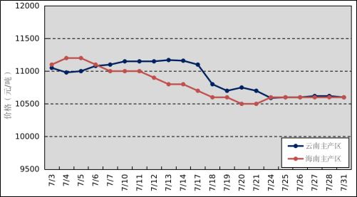 國(guó)內(nèi)主產(chǎn)區(qū):7月,國(guó)內(nèi)產(chǎn)區(qū)正常割膠,其中,云南降雨偏多,產(chǎn)量較往年同期偏少;海南上中旬穩(wěn)定上量,中下旬受臺(tái)風(fēng)天氣影響,膠水產(chǎn)出有所減少。云南和海南原料膠(折干膠)月均價(jià)格分別為10889元/噸、10790元/噸,環(huán)比下跌107元/噸、495元/噸。