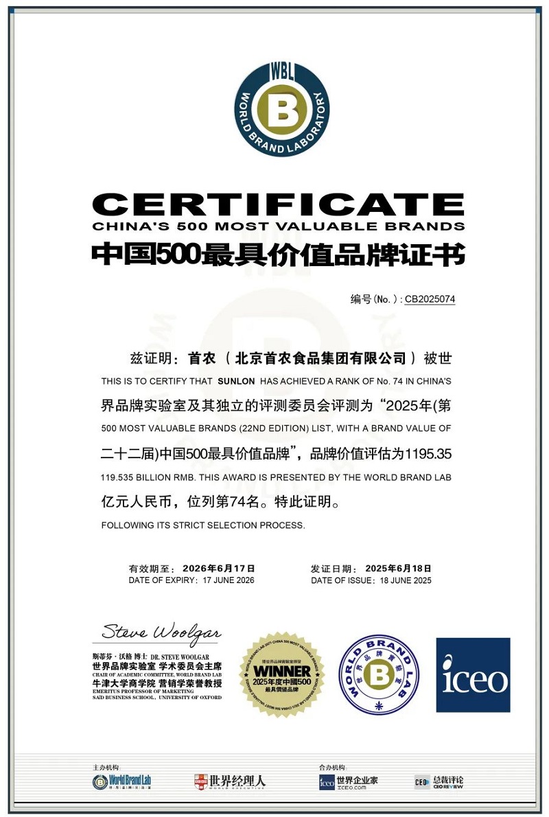 6月18日,第二十二屆“世界品牌大會”在北京舉行,會上發(fā)布了2025年《中國500最具價值品牌》分析報告。在這份基于財務(wù)數(shù)據(jù)、品牌強度和消費者行為分析的年度報告中,“首農(nóng)”2025年的品牌價值為1195.35億元,總排名位列500強第74位,品牌價值較2024年增長了9.9%,排名提升了1個位次。