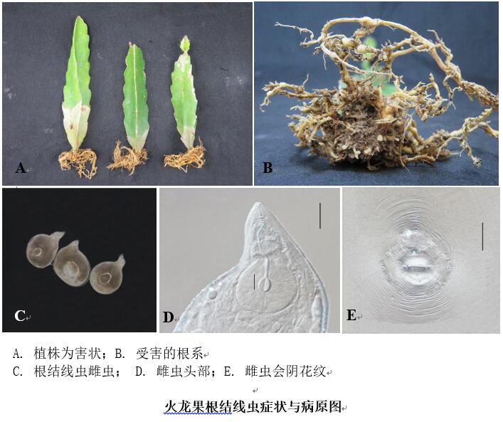 近期,病蟲害防控項目組專家在福建省漳州與泉州火龍果種植區(qū)調(diào)查發(fā)現(xiàn)根結(jié)線蟲為害火龍果。為害前期,植株地上部癥狀不明顯,受害嚴重時,地上部枝條生長緩慢,表皮由深綠色轉(zhuǎn)為黃綠色,莖肉縮水變扁,植株呈凋萎狀,受害根部??梢姶笮〔灰坏母Y(jié),新根少;發(fā)病后期根系變褐、腐爛。鏡檢解剖根部可見乳白色或淺黃色的雌蟲寄生于根內(nèi),根外肉眼可見根結(jié)線蟲膠質(zhì)狀的卵囊。經(jīng)分離與鑒定,確定為害閩南火龍果根結(jié)線蟲的種為南方根結(jié)線蟲(Meloidogyne incongnita)和象耳豆根結(jié)線蟲(M. enterolobii)。其中,象耳豆根結(jié)線蟲是目前生產(chǎn)上重要病原線蟲,其寄主范圍廣、致病性強,近年來已在閩南地區(qū)多種作物和果樹上發(fā)現(xiàn)為害,應(yīng)引起足夠重視,防止傳播擴散。因此,各監(jiān)測站和生產(chǎn)部門應(yīng)引起重視,指導(dǎo)果農(nóng)及時開展防治。項目組專家提出如下防控建議。