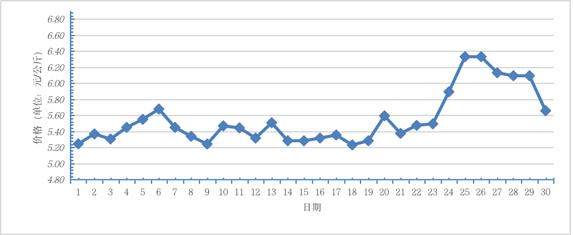 11月,全國(guó)重點(diǎn)監(jiān)測(cè)農(nóng)產(chǎn)品批發(fā)市場(chǎng)香蕉總交易量達(dá) 2.7萬噸,同比下降70.0%,環(huán)比下降12.9%;總交易價(jià)值 15155.0萬元,同比下降68.8%,環(huán)比下降14.6%。日平均價(jià)格最高為6.3元/千克,最低為5.2元/千克,全月平均價(jià)格為 5.6元/千克,同比上漲5.7%,環(huán)比上漲1.8%(每日價(jià)格變化如圖)。
