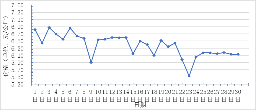 11月,全國重點監(jiān)測農(nóng)產(chǎn)品批發(fā)市場香蕉總交易量達2.4萬噸,同比下降7.7%,環(huán)比上漲4.3%;總交易價值14457.1萬元,同比下降11.8%,環(huán)比下降5.8%。日平均價格最高為6.9元/千克,最低為5.5元/千克,全月平均價格為6.4元/千克,同比上漲6.7%,環(huán)比下降7.2%(每日價格變化如圖)。