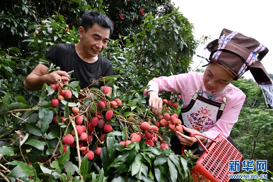 村民采摘荔枝(6月9日攝)。新華網(wǎng)發(fā)(熊平祥攝)