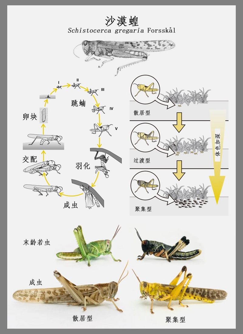 近期國(guó)外遭遇的沙漠蝗災(zāi)害,被認(rèn)為是世界上最具破壞性害蟲之一,起源于非洲,目前主要分布于非洲大陸、中東、南亞、西亞以及地中海沿岸,嚴(yán)重暴發(fā)的國(guó)家和地區(qū)多達(dá)60多個(gè)。在國(guó)內(nèi)曾有分類學(xué)上的記載,但中國(guó)不是沙漠蝗的分布區(qū),過(guò)去曾頻繁暴發(fā)的蝗災(zāi)并非沙漠蝗引起。沙漠蝗具有暴發(fā)性、遷飛性和毀滅性危害特點(diǎn),嚴(yán)重時(shí)蟲口密度,每平方公里可達(dá)8000萬(wàn)只、進(jìn)食量與3.5萬(wàn)人的進(jìn)食量相當(dāng),每天可以隨風(fēng)飛行150公里,被蝗蟲肆虐過(guò)的作物可以說(shuō)是寸葉不留。危害植物包括水稻、小麥、大麥、玉米等谷物,番茄、馬鈴薯、瓜類等各類蔬菜,苜蓿、豆類、棉花、煙草、花生等農(nóng)作物及葡萄、扁桃、杏樹、柑桔、香蕉、番木瓜、海棗、無(wú)花果、石榴等果樹和桑樹、咖啡等。目前尚未發(fā)現(xiàn)危害橡膠的報(bào)道。沙漠蝗嗜好在濕潤(rùn)的沙地上產(chǎn)卵,每平方米多達(dá)上百個(gè)卵塊,每雌可產(chǎn)3—4個(gè)卵塊150—240粒卵。卵期3周左右,土壤濕度充分時(shí)16—17天可孵化,干燥條件下則長(zhǎng)達(dá)近40天。從蝗蝻發(fā)育至成蟲大約需要一個(gè)月,成蟲羽化約1個(gè)月后開始配對(duì)。沙漠蝗分聚集型和散居型,兩種類型在個(gè)體大小、體色及生物學(xué)特性等存在一定差別。據(jù)專家分析,當(dāng)前沙漠蝗的暴發(fā)與蟲源積累及降雨偏多有關(guān)。