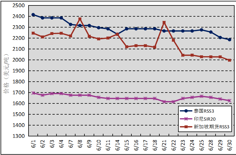國外主產(chǎn)區(qū):6月,泰國RSS3平均價(jià)格為2294美元/噸,環(huán)比下降82美元/噸,最高價(jià)為2415美元/噸,最低價(jià)為2185美元/噸;印尼SIR20平均價(jià)格為1655美元/噸,環(huán)比下降47美元/噸,最高價(jià)為1695美元/噸,最低價(jià)為1615美元/噸;新加坡RSS3期貨主力合約月均結(jié)算價(jià)格為2162美元/噸,環(huán)比下降161美元/噸,最高價(jià)為2376美元/噸,最低價(jià)為1996美元/噸。