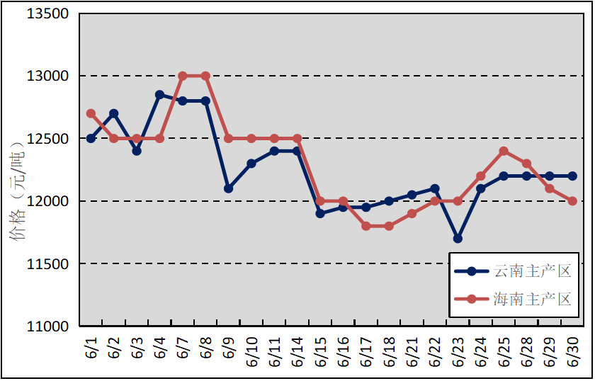 國內(nèi)主產(chǎn)區(qū):6月,我國天然橡膠主產(chǎn)區(qū)逐漸步入旺產(chǎn)季。海南原料膠(折干膠)月均價(jià)格為12305元/噸,環(huán)比下降890元/噸,云南原料膠(折干膠)月均價(jià)格為12264元/噸,環(huán)比下降789元/噸。