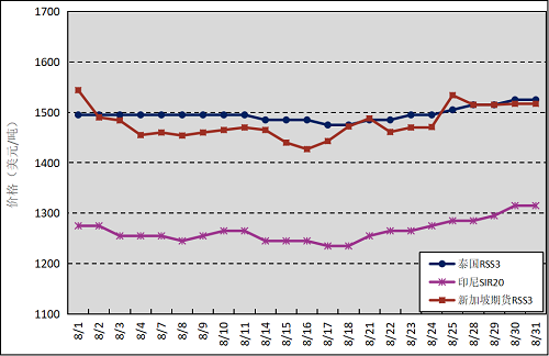 國(guó)外主產(chǎn)區(qū):8月,泰國(guó)RSS3平均價(jià)格為1496美元/噸,環(huán)比下跌19美元/噸,最高價(jià)為1525美元/噸,最低價(jià)為1475美元/噸;印尼SIR20平均價(jià)格為1265美元/噸,環(huán)比下跌10美元/噸,最高價(jià)為1315美元/噸,最低價(jià)為1235美元/噸;新加坡RSS3期貨主力合約月均結(jié)算價(jià)格為1479美元/噸,環(huán)比下跌21美元/噸,最高價(jià)為1544美元/噸,最低價(jià)為1427美元/噸。