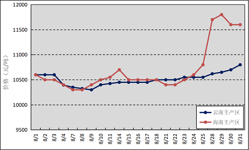 國(guó)內(nèi)主產(chǎn)區(qū):8月,國(guó)內(nèi)產(chǎn)區(qū)受降雨偏多以及臺(tái)風(fēng)、高溫等異常天氣擾動(dòng)影響,原料膠產(chǎn)出有限,月內(nèi)原料膠價(jià)格出現(xiàn)不同程度上漲,其中,海南產(chǎn)區(qū)月末膠水價(jià)格拉漲明顯,但本月均價(jià)仍低于上月的。云南和海南原料膠(折干膠)月均價(jià)格分別為10509元/噸、10702元/噸,環(huán)比下跌380元/噸、88元/噸。