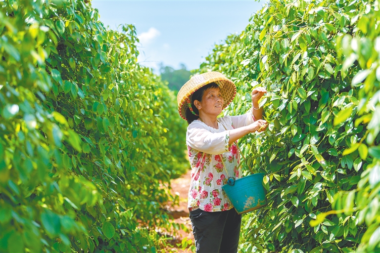 “現(xiàn)在是胡椒掛果期,每天一早,我就來采摘胡椒,直到中午才回家吃飯?!痹诜N植基地里,黃麗貞是最早到達(dá)、最晚離開的那批人之一。2015年,在公司工會(huì)幫扶下,她管起5畝地800株胡椒,如今每年能有三四萬元收入。