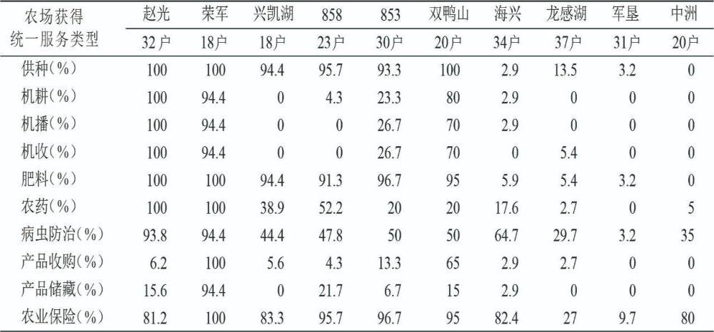 表1 土地承包租賃戶從農(nóng)場(chǎng)獲得各類統(tǒng)一服務(wù)情況   單位:戶、%