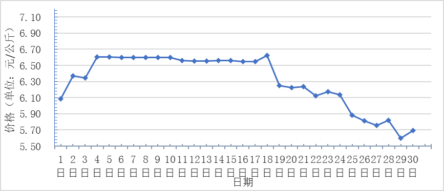 9月,全國重點(diǎn)監(jiān)測農(nóng)產(chǎn)品批發(fā)市場香蕉總交易量達(dá)2.5萬噸,同比下降10.7%,環(huán)比上漲8.7%;總交易價(jià)值 16111.8萬元,同比下降4%,環(huán)比上漲11.6%。日平均價(jià)格最高為6.6元/千克,最低為5.6元/千克,全月平均價(jià)格為6.3元/千克,同比上漲14.5%,環(huán)比上漲3.3%(每日價(jià)格變化如圖)。