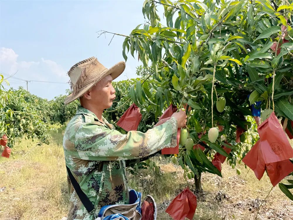 在烏烈鎮(zhèn)峨溝村芒果種植戶梁明章的果園里,沉甸甸的芒果掛滿枝頭,空氣中彌漫著香甜的氣息。工人們正有條不紊地為芒果套袋、修枝,提高樹體透氣性和通風性,幫助芒果高產(chǎn)優(yōu)產(chǎn)。據(jù)介紹,梁明章的果園面積達300畝,包括紅玉、貴妃及臺農(nóng)等品種。每年產(chǎn)出的芒果主要銷往北京、山東、寧夏及兩廣等地。其中,果園的優(yōu)質(zhì)紅玉還出口俄羅斯。為了更好地照料果樹,梁明章的果園長期聘用了7名工人。到芒果采收高峰期,果園一天聘用的工人可達70至80人。