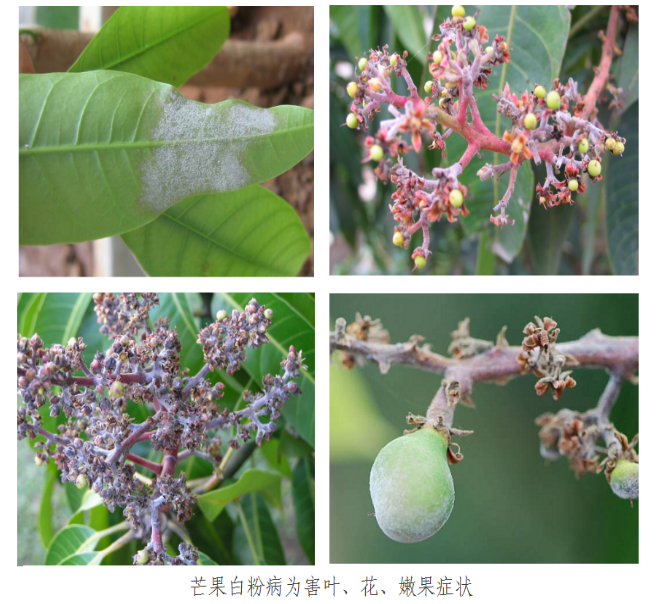 當(dāng)前,廣西、云南、四川、廣東、貴州、福建等主產(chǎn)區(qū)的芒果正處于花果期、果實膨大期等物候期,果園內(nèi)濕度高、氣溫低,芒果白粉病易于發(fā)生危害。開始時該病害在葉片上產(chǎn)生白色粉狀物,逐漸在老葉上產(chǎn)生紅褐色病斑;侵染花穗時,在花穗上產(chǎn)生白色粉狀物,小花穗褐色枯死,降低坐果率,落花落果嚴(yán)重;侵染幼嫩果實時,白色粉狀物覆蓋幼果,果皮逐漸凹陷、粗糙,產(chǎn)生紅褐色銹狀物。