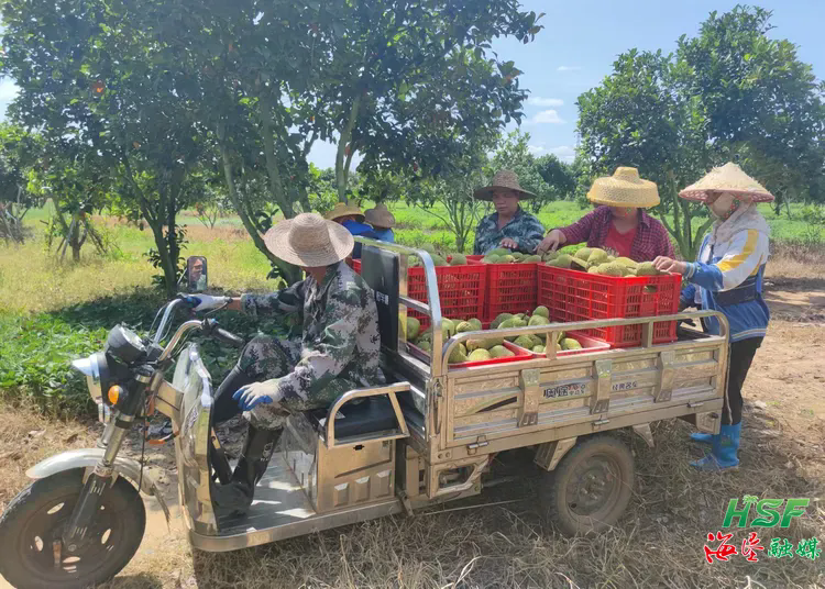 近日,在八一總場公司老根466畝榴蓮蜜基地,有的工人手持剪刀將樹上一個(gè)個(gè)果型飽滿的榴蓮蜜剪下來,有的工人將榴蓮蜜分揀到籮筐里,還有的工人騎著三輪車將一筐筐果實(shí)運(yùn)送集中起來,整個(gè)基地洋溢著豐收的喜悅。