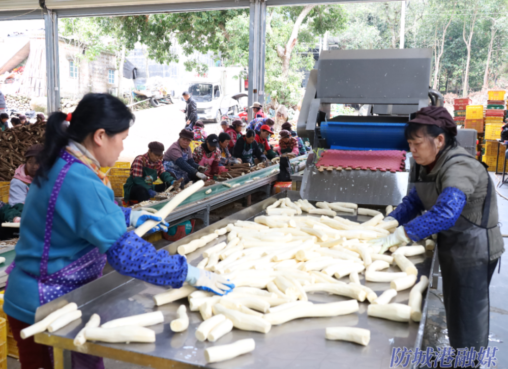 如今,大菉鎮(zhèn)木薯產(chǎn)業(yè)已經(jīng)逐漸形成加工業(yè)態(tài),轄區(qū)內(nèi)有喜農(nóng)人種養(yǎng)專業(yè)合作社、細(xì)垌種養(yǎng)專業(yè)合作社、桂啟程農(nóng)業(yè)科技有限公司等企業(yè)專門從事黃心木薯加工業(yè)務(wù)。在木薯集中上市期間,每天可帶動約300多名村民參與務(wù)工,助力增收。一根小小的木薯,正筑就著富民強(qiáng)鎮(zhèn)的產(chǎn)業(yè)基石。