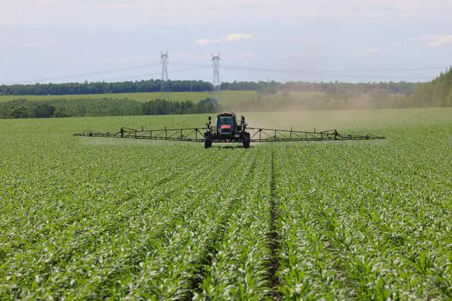 6月24日,在北大荒集團北安分公司二龍山農(nóng)場有限公司第六管理區(qū)的玉米種植地塊,一臺自走式噴藥機在噴施肥料。新華社發(fā)(錢泊羽攝)
