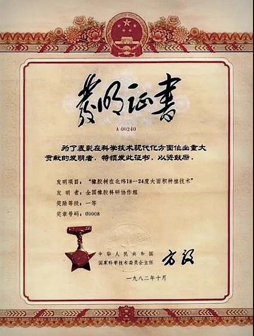 ▼“橡膠樹在北緯18-24度大面積種植技術(shù)”獲國家發(fā)明一等獎(jiǎng)證書