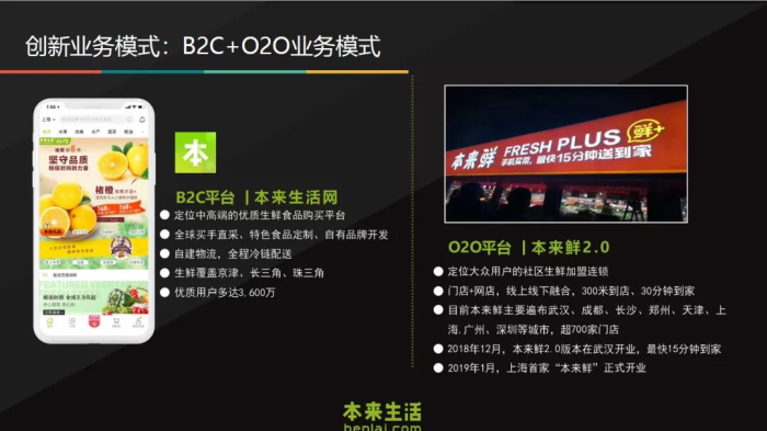 本來集團(tuán)創(chuàng)辦于2012年7月,是一家同時(shí)具備農(nóng)產(chǎn)品供應(yīng)鏈全程化管理服務(wù)、自有品牌塑造、媒體整合營(yíng)銷、自有冷鏈物流、線上生鮮電商、社區(qū)生鮮連鎖新零售等綜合能力的生鮮全產(chǎn)業(yè)鏈集團(tuán)公司,致力于改善食品安全現(xiàn)狀、倡導(dǎo)健康生活方式,憑借八年來在生鮮領(lǐng)域的不斷探索與創(chuàng)新,本來集團(tuán)成功建立起O2O(社區(qū)生鮮連鎖本來鮮)+B2C(本來生活網(wǎng))的新零售模型,該模式可以同時(shí)解決時(shí)效、新鮮度、流量、履約成本的要求,通過線上線下渠道的打通、互補(bǔ),圍繞供應(yīng)鏈、零售端、用戶端創(chuàng)造價(jià)值。