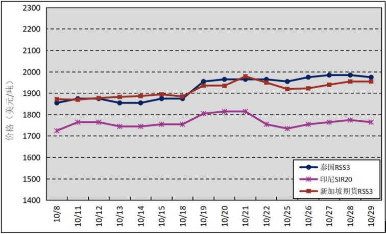 國(guó)外主產(chǎn)區(qū):10月,泰國(guó)RSS3平均價(jià)格為1924美元/噸,環(huán)比上漲95美元/噸,最高價(jià)為1985美元/噸,最低價(jià)為1855美元/噸;印尼SIR20平均價(jià)格為1765美元/噸,環(huán)比上漲107美元/噸,最高價(jià)為1815美元/噸,最低價(jià)為1725美元/噸;新加坡RSS3期貨主力合約月均結(jié)算價(jià)格為1916美元/噸,環(huán)比上漲128美元/噸,最高價(jià)為1979美元/噸,最低價(jià)為1870美元/噸。