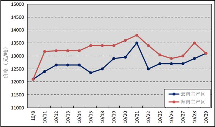 國(guó)內(nèi)主產(chǎn)區(qū):10月,我國(guó)天然橡膠主產(chǎn)區(qū)仍處于割膠旺季,但降雨較多、海南主產(chǎn)區(qū)遭受臺(tái)風(fēng)襲擊,割膠生產(chǎn)和橡膠產(chǎn)量受到一定影響。海南原料膠(折干膠)月均價(jià)格為13213元/噸,環(huán)比上漲1113元/噸;云南原料膠(折干膠)月均價(jià)格為12703元/噸,環(huán)比上漲932元/噸。