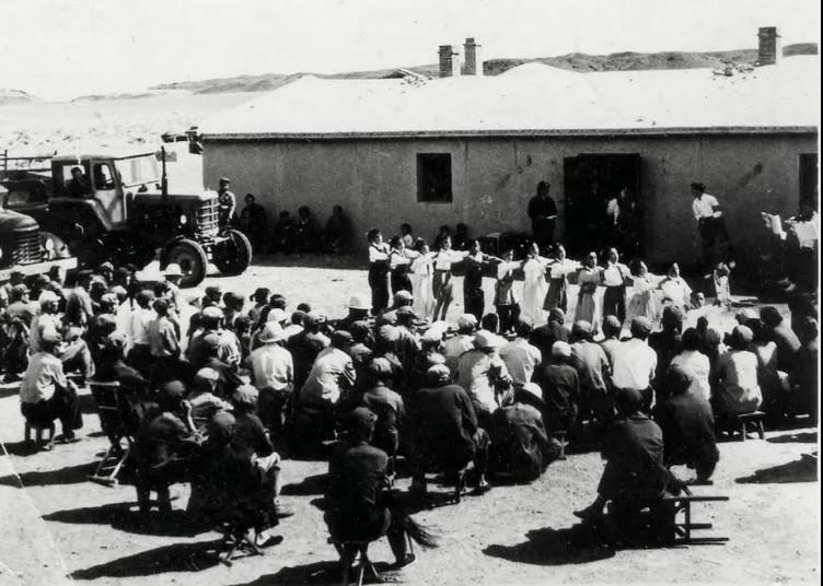 兵團(tuán)第一代開拓者在荒灘戈壁上挖地窩子,以此為家。后來脫土坯蓋平房,蓋起了商店和醫(yī)院,還建了大禮堂。