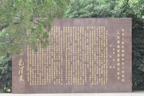 農(nóng)建四師暨淮海農(nóng)場(chǎng)歷史陳列館是在農(nóng)建四師大院舊址上建起來(lái)的。走進(jìn)院門(mén),迎面矗立著的是一座由大理石雕刻的碑文?!皩⒐鈽s的祖國(guó)經(jīng)濟(jì)建設(shè)任務(wù)賦予你們……當(dāng)祖國(guó)需要召喚你們的時(shí)候,我將命令你們重新拿起戰(zhàn)斗武器,捍衛(wèi)祖國(guó)。”游客來(lái)到農(nóng)建四師大院參觀時(shí),陳列館解說(shuō)員首先向游客介紹毛主席的這份命令。