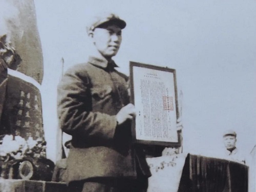 1952年4月20日上午8點(diǎn),102師近萬(wàn)余官兵正點(diǎn)到達(dá)海門(mén)縣三廠鎮(zhèn)廣場(chǎng),在這里集結(jié)并舉行誓師大會(huì)。蘇北軍區(qū)副司令員常玉清,在師首長(zhǎng)陪同下檢閱了部隊(duì)后,代表人民革命軍事委員會(huì),向全師指戰(zhàn)員宣布毛澤東主席命令:“中國(guó)人民解放軍步兵第102師改編為農(nóng)業(yè)建設(shè)第四師”。