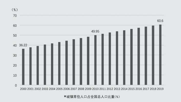圖3 2000年~2019年我國城鎮(zhèn)常住人口占全國總人口的比重