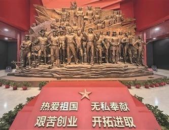 瞻仰完王震將軍的雕塑后,走進(jìn)新疆兵團(tuán)軍墾博物館,兵團(tuán)精神“熱愛(ài)祖國(guó)、無(wú)私奉獻(xiàn)、艱苦創(chuàng)業(yè)、開(kāi)拓進(jìn)取”16個(gè)大字最先映入眼簾。其后,一座巨型雕像把軍墾前輩們昂揚(yáng)的精神面貌定格在時(shí)間的長(zhǎng)河中。1954年,新疆生產(chǎn)建設(shè)兵團(tuán)正式成立。10萬(wàn)將士,懷著對(duì)祖國(guó)的無(wú)限忠誠(chéng)與熱愛(ài),從硝煙彌漫的戰(zhàn)場(chǎng)轉(zhuǎn)戰(zhàn)荒無(wú)人煙的戈壁大漠,肩負(fù)起屯墾戍邊的使命,在戈壁荒灘上開(kāi)墾出一片片綠洲。