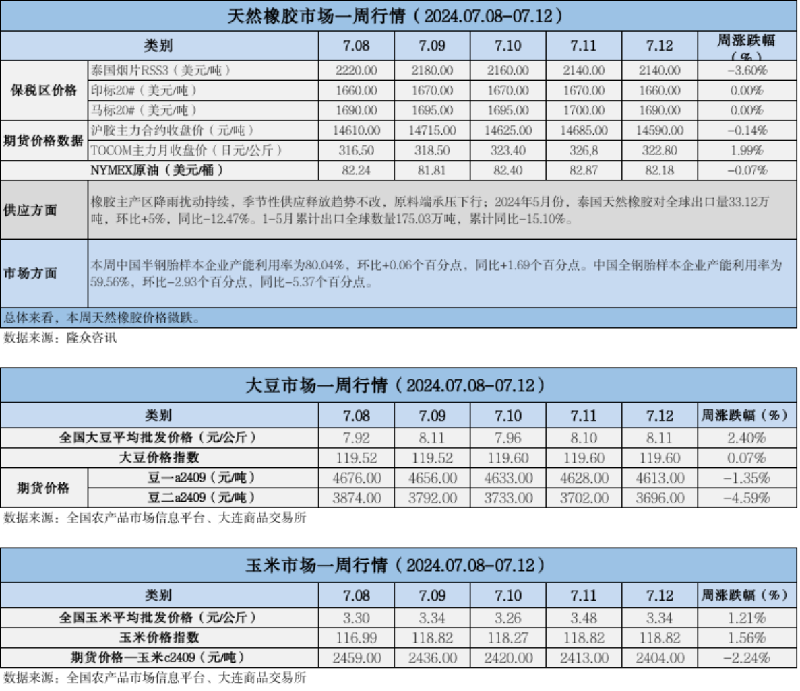 天然橡膠、大豆、玉米市場一周行情(2024.07.08-07.12)