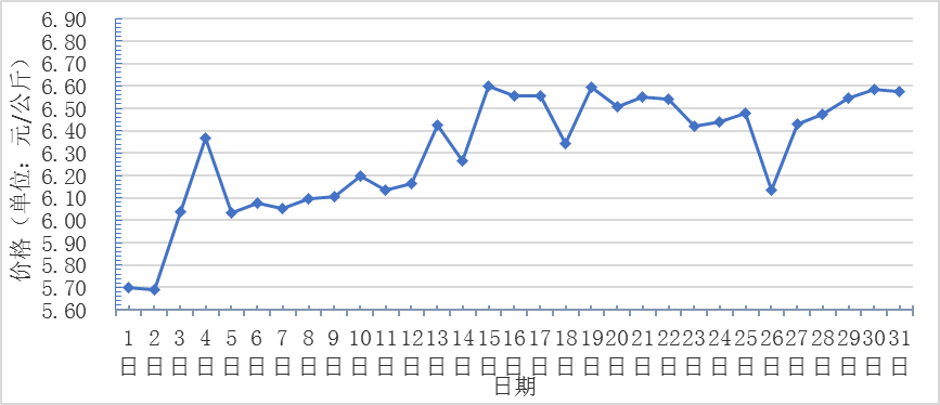 3月,全國重點(diǎn)監(jiān)測農(nóng)產(chǎn)品批發(fā)市場香蕉總交易量達(dá)2.8萬噸,同比上漲21.7%,環(huán)比上漲27.2%;總交易價(jià)值19783.2萬元,同比上漲12.3%,環(huán)比上漲34.2%。日平均價(jià)格最高為6.6元/千克,最低為5.7元/千克,全月平均價(jià)格為 6.4元/千克,同比上漲8.5%,環(huán)比下降4.5%(每日價(jià)格變化如圖)。