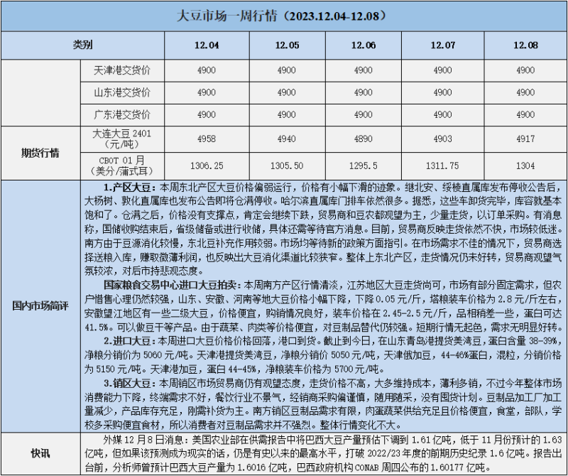 天然橡膠、大豆、玉米市場一周行情(2023.12.04-12.08)