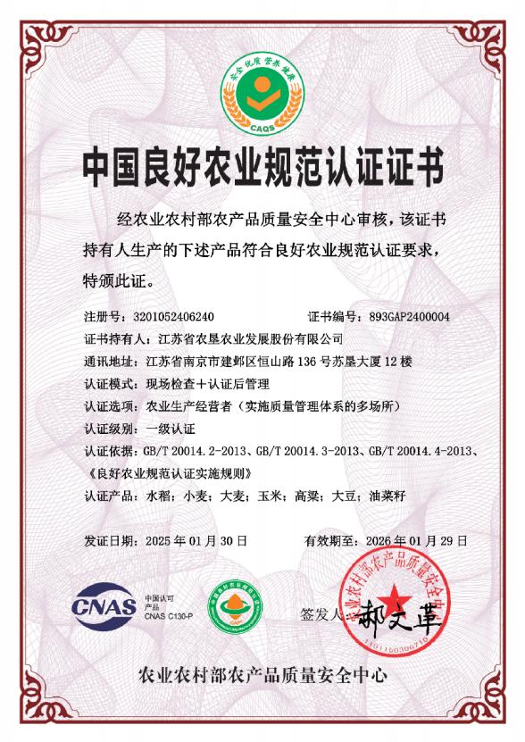 2024年,蘇墾農(nóng)發(fā)為強(qiáng)化農(nóng)產(chǎn)品生產(chǎn)全過程的質(zhì)量與安全管理,提高種植基地農(nóng)業(yè)生產(chǎn)標(biāo)準(zhǔn)化、規(guī)范化和可持續(xù)發(fā)展水平,認(rèn)證并通過了20家種植基地水稻、小麥、大麥、玉米、大豆、油菜、高粱等7種作物的全國良好農(nóng)業(yè)規(guī)范(GAP)一級(jí)認(rèn)證,率先通過農(nóng)業(yè)農(nóng)村部農(nóng)產(chǎn)品質(zhì)量安全中心良好農(nóng)業(yè)規(guī)范(GAP)質(zhì)量管理體系的多場(chǎng)所認(rèn)證,是全國單體規(guī)模最大的一級(jí)認(rèn)證單位。一年來,公司依托全產(chǎn)業(yè)鏈縱向一體化管理優(yōu)勢(shì),對(duì)種植基地生產(chǎn)環(huán)境質(zhì)量、投入品使用、農(nóng)產(chǎn)品質(zhì)量控制等方面進(jìn)行嚴(yán)格規(guī)范化管理,全面提升農(nóng)業(yè)生產(chǎn)標(biāo)準(zhǔn)化、規(guī)范化管理水平,為公司農(nóng)業(yè)生產(chǎn)可持續(xù)發(fā)展提供了保障。