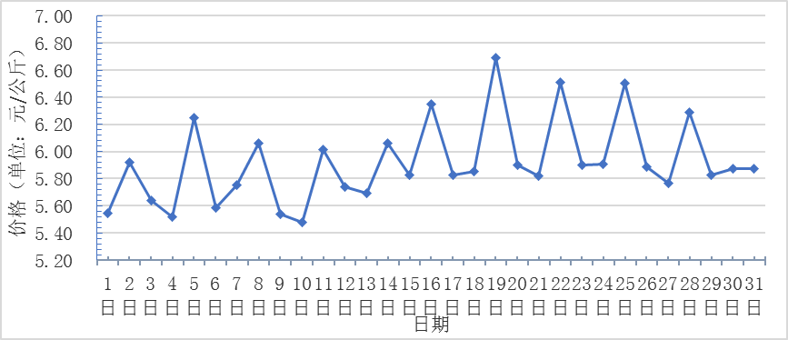 7月,全國(guó)重點(diǎn)監(jiān)測(cè)農(nóng)產(chǎn)品批發(fā)市場(chǎng)香蕉總交易量達(dá)2.3萬(wàn)噸,同比上漲9.5%,環(huán)比上漲4.5%;總交易價(jià)值12746.5萬(wàn)元,同比下降6.4%,環(huán)比上漲11.0%。日平均價(jià)格最高為6.7元/千克,最低為5.5元/千克,全月平均價(jià)格為 5.9元/千克,同比下降13.2%,環(huán)比上漲1.7%(每日價(jià)格變化如圖)。